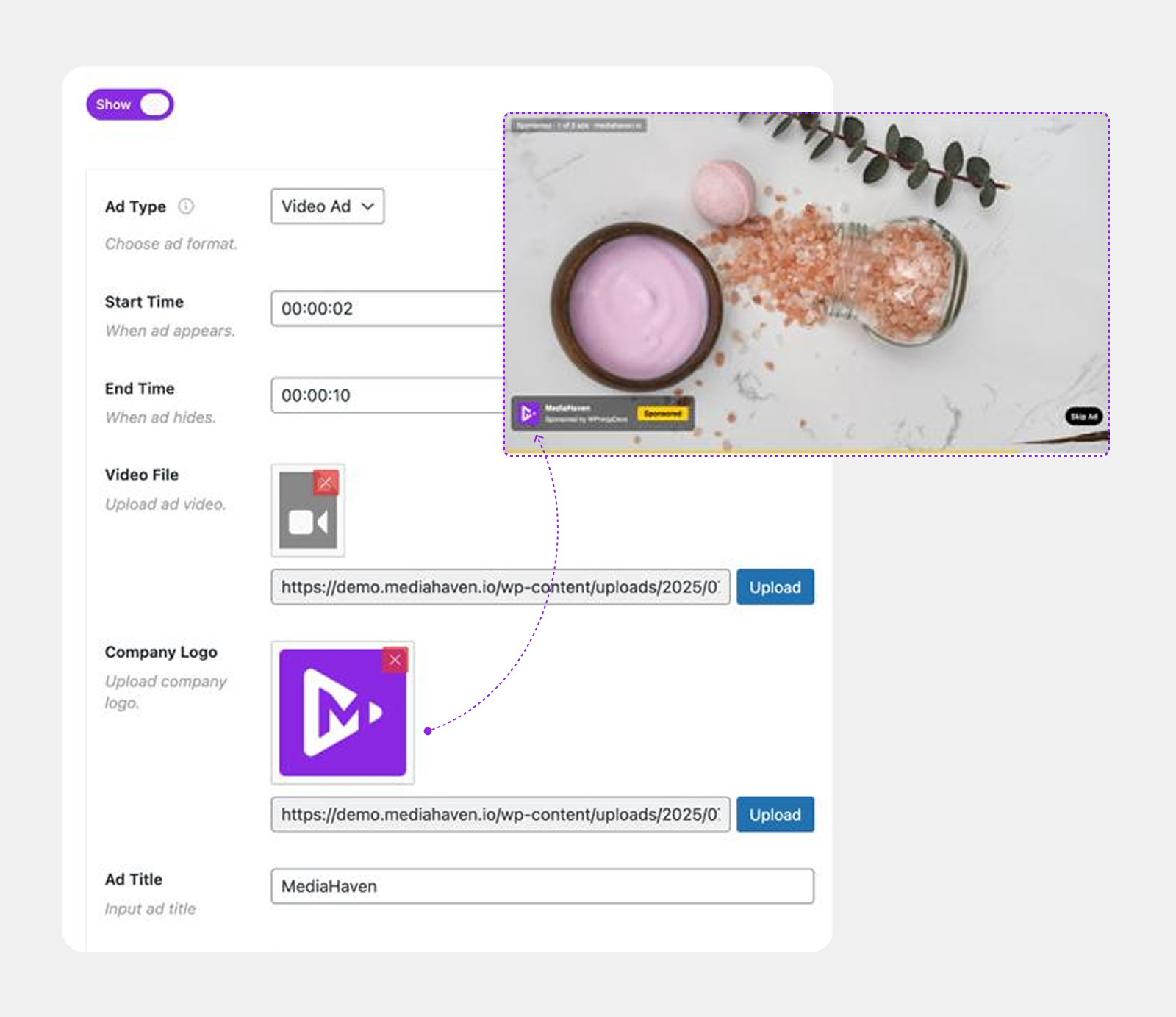 - Flexible ad positions: pre-roll, mid-roll, post-roll, or custom timestamps