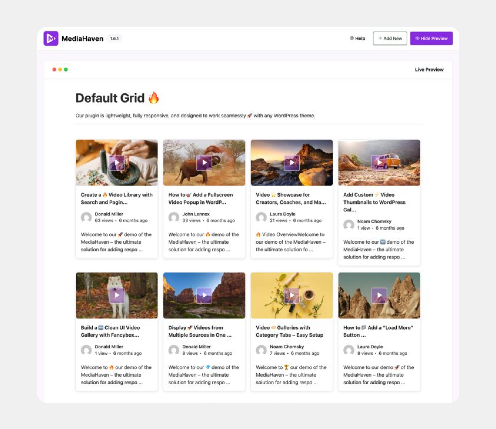 MediaHaven eliminates the headache of managing videos across multiple platforms. Build a lightning-fast, fully responsive WordPress video gallery that supports all major video sources—without switching plugins or breaking layouts.