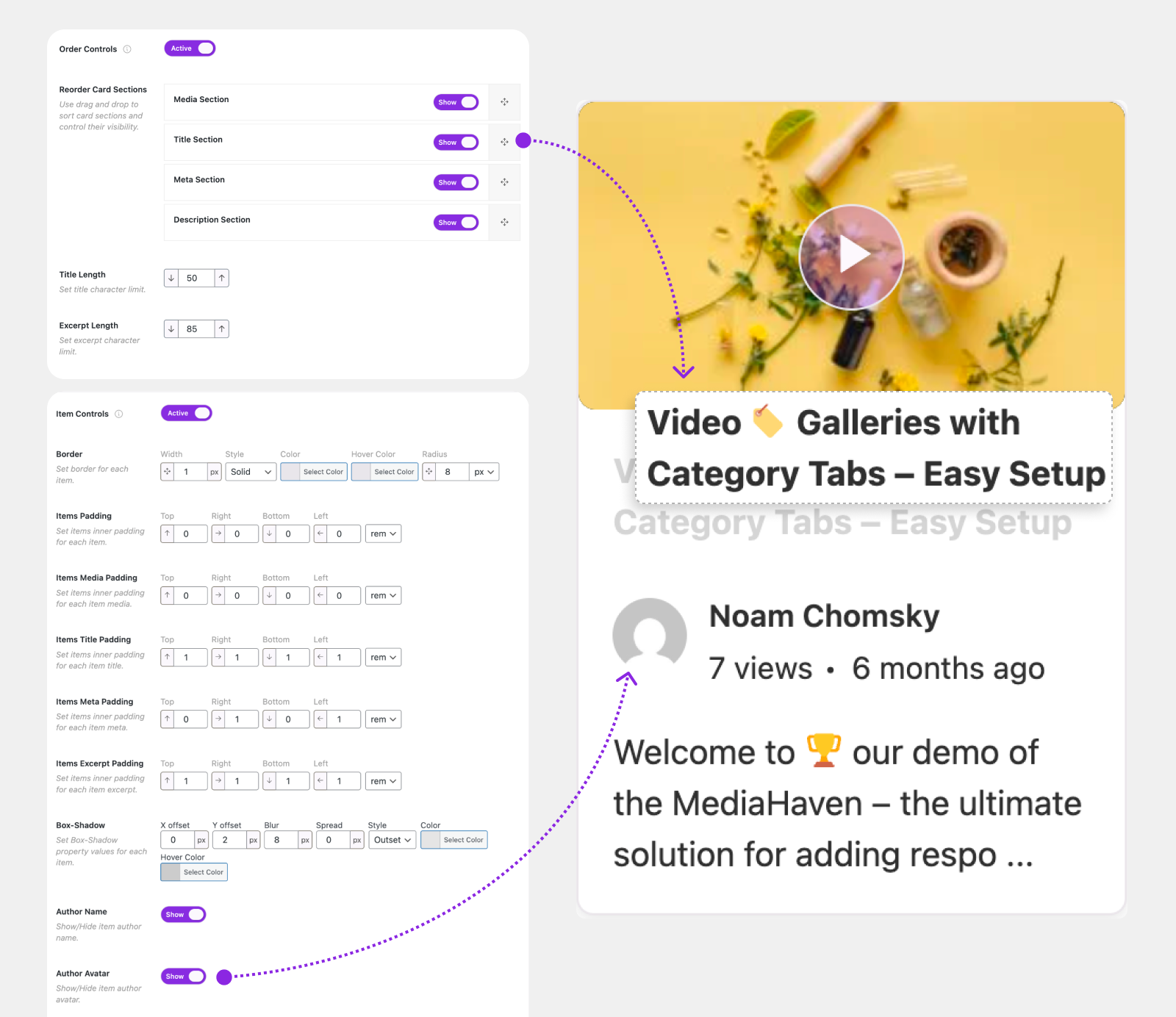 - Toggle author, avatar, views, date, comments, likes, categories, and tags