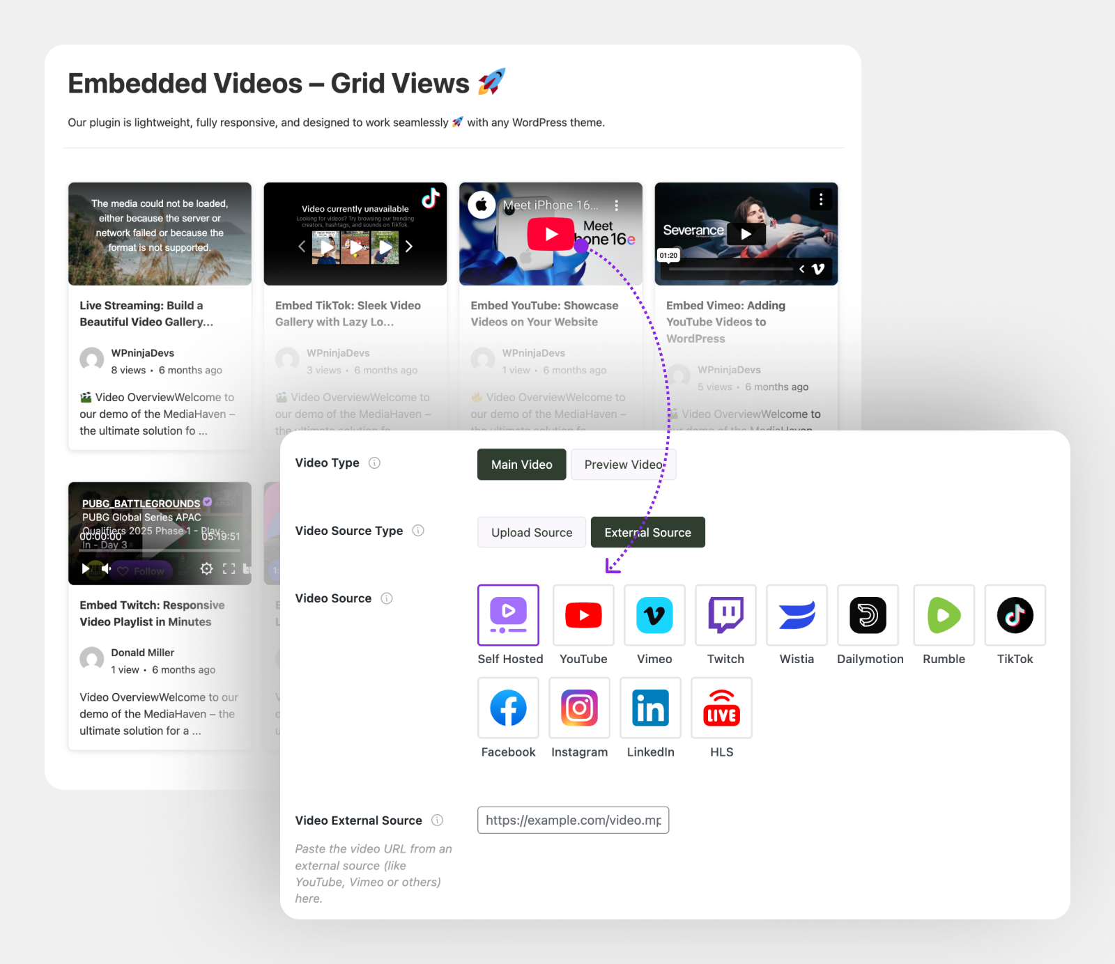 - Compatible with Self-Hosted Video, YouTube Feeds, YouTube Playlist, Vimeo embed, HLS etc.